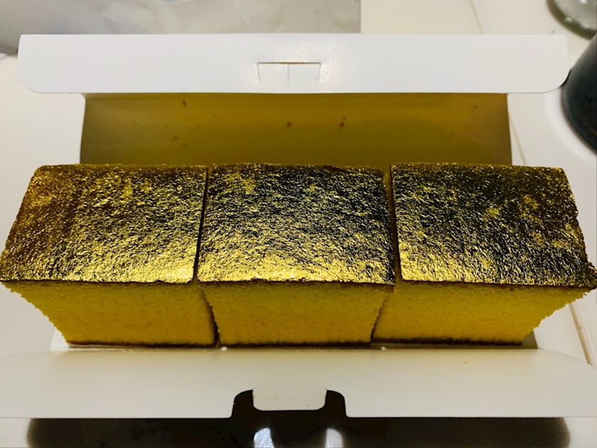 一枚の金箔が貼り付けてあるカステラ
