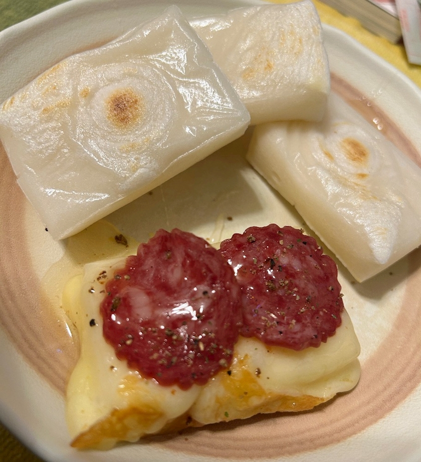 チーズとサラミとハチミツでピザ風餅!🍕