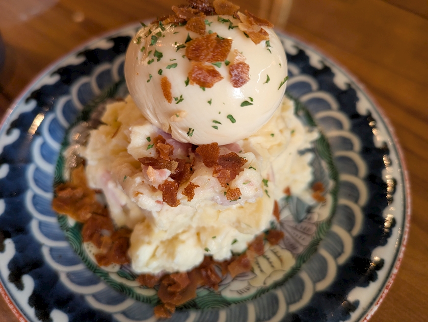 1番上に半熟たまごにオニオンチップ