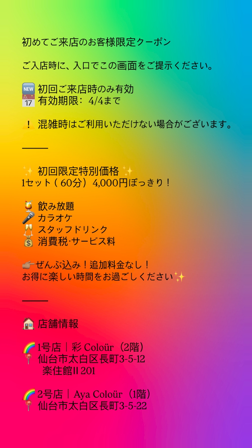 🌈初めてご来店のお客様限定クーポン🌈 - あや - 彩colour・アヤカラー - 長町のガールズバー