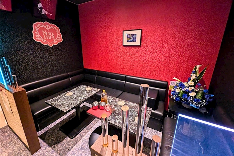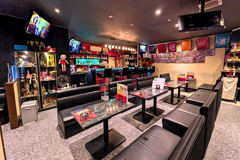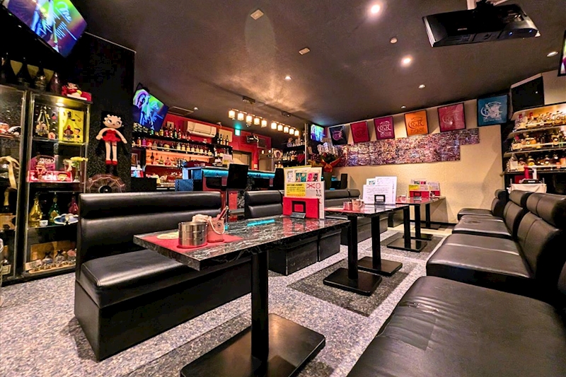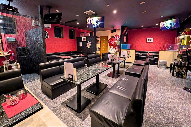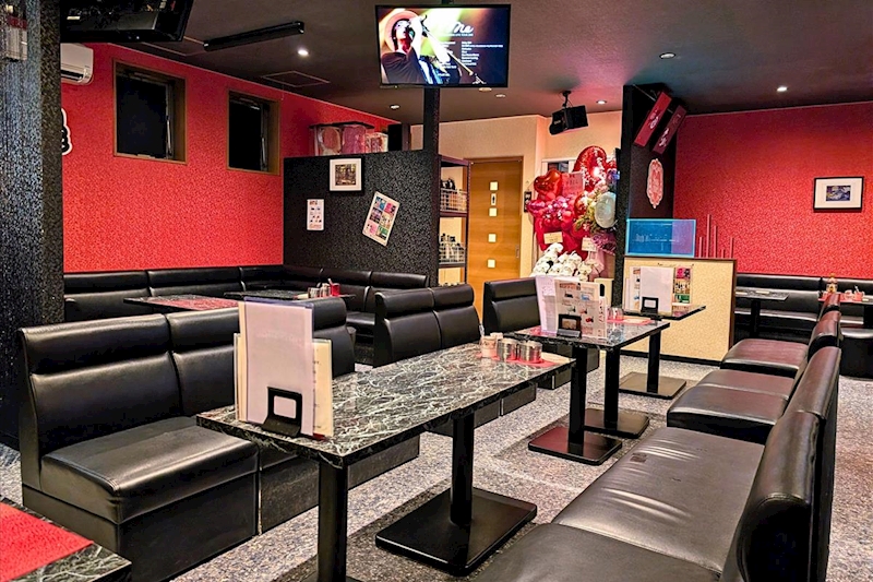 赤いドアが目印で、開けると広々とした空間が広がり黒いソファーと赤い壁の差し色がアクセントになった、シックでオシャレなスナックです。