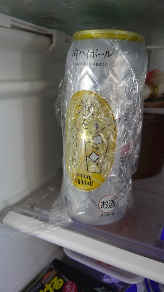 冷蔵庫開けたらハイボールにラップしてあった。