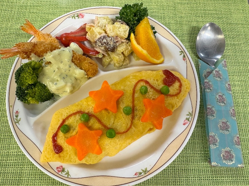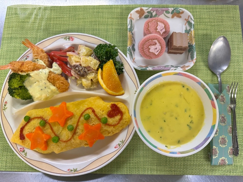 スープとデザートも🍰(スプーン入れは折り紙で作りました🩷)