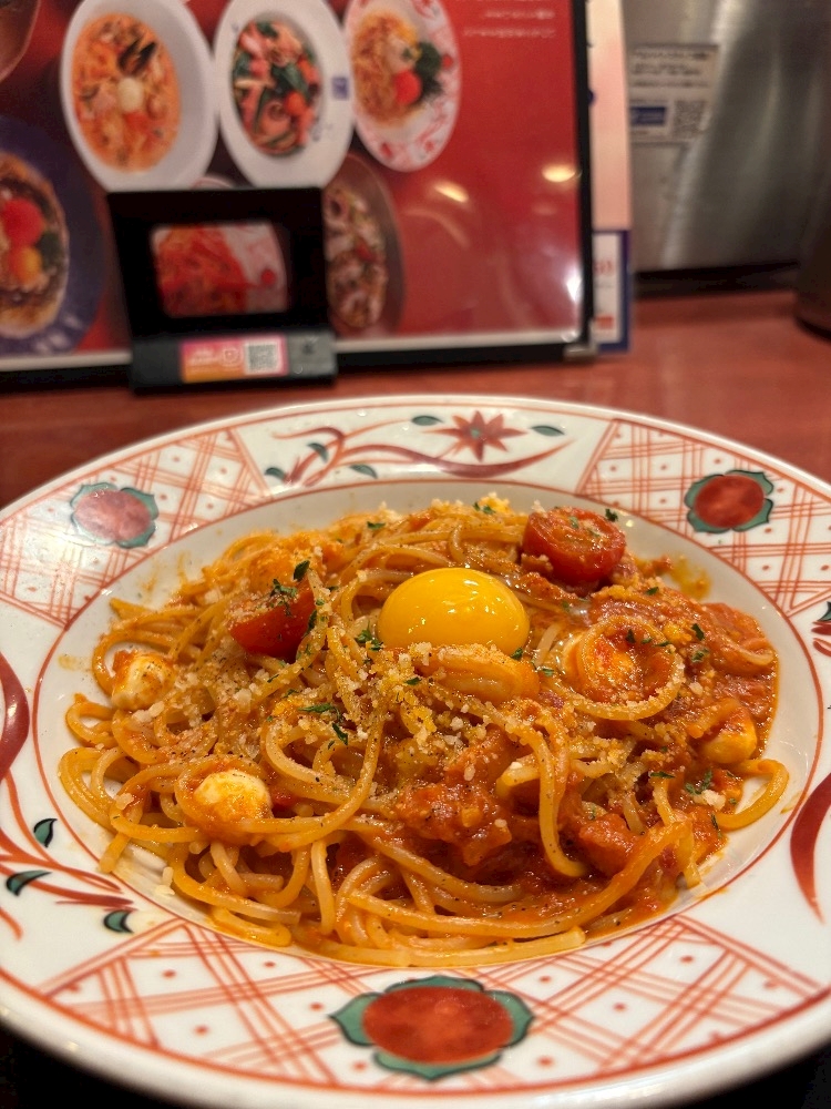 海老とモッツァレラチーズのカルボナーラチリトマトソース