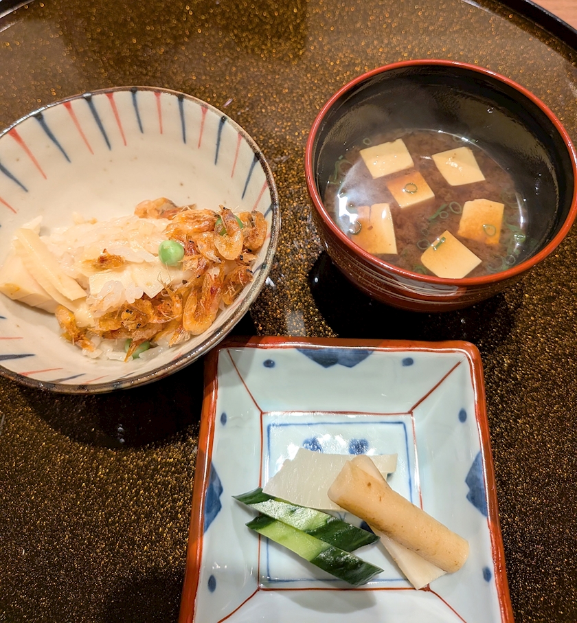 赤だしの味噌汁と自家製漬物と共に〜