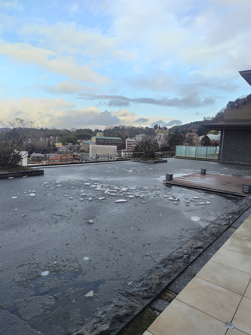 テラスの水凍ってた