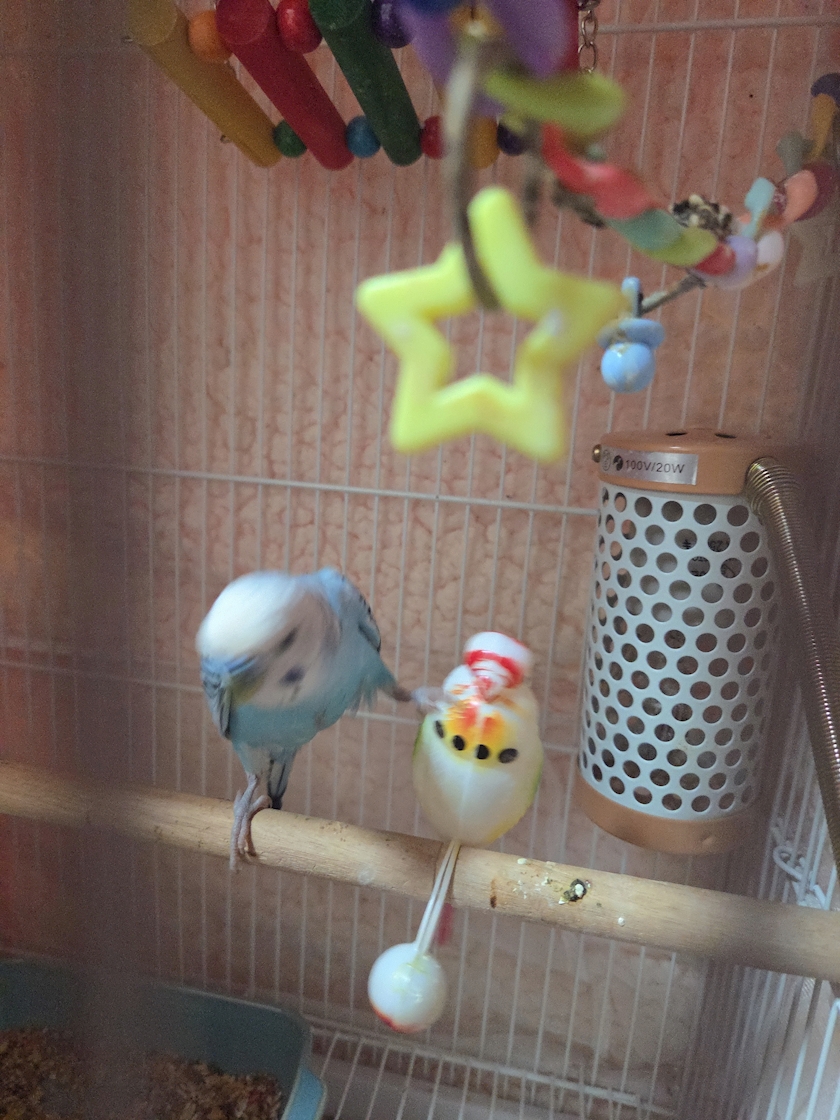 Pちゃんの鳥籠に入れてるセキセイインコの玩具プー子さん🦜の事が大好きなPちゃん🐦