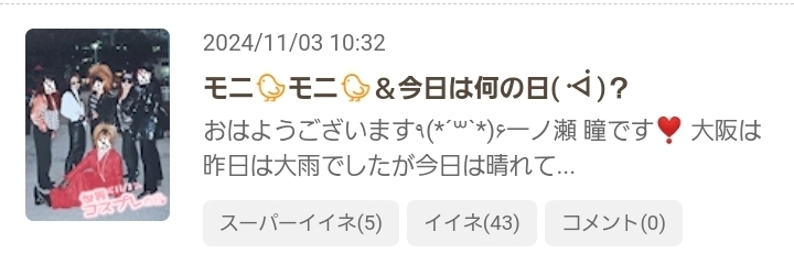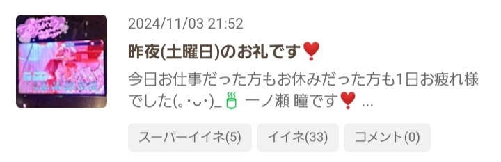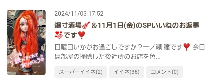 出勤中~ᐕ)ノ&11月3日(日)のSPいいねのお返事💌です❣️ - 一ノ瀬 瞳 - Mrs.J 梅田・ミセス ジェイ ウメダ - 梅田の熟女パブ/熟女キャバクラ