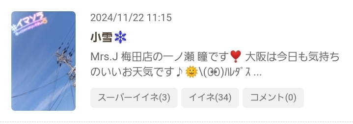 明日の天気☔&11月22日(金)のSPいいねのお返事💌です❣️ - 一ノ瀬 瞳 - Mrs.J 梅田・ミセス ジェイ ウメダ - 梅田の熟女パブ/熟女キャバクラ