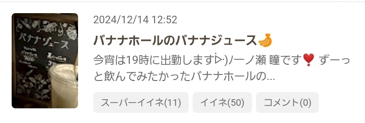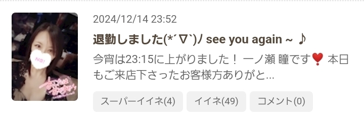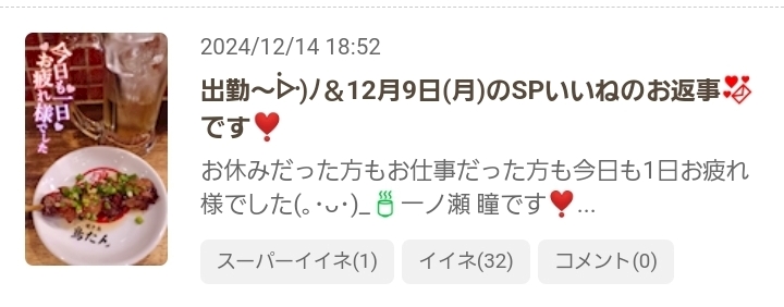 出勤中~ᐕ)ノ&12月14日(土)のSPいいねのお返事💌です❣️ - 一ノ瀬 瞳 - Mrs.J 梅田・ミセス ジェイ ウメダ - 梅田の熟女パブ/熟女キャバクラ