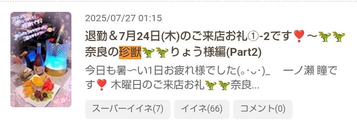 奈良県橿原市🍸Club Beniさんの 🦖🦖奈良の珍獣🦖🦖りょう🦖🦖さんに会いに行った日の口コミ体験談 - 一ノ瀬 瞳 - Mrs.J 梅田・ミセス ジェイ ウメダ - 梅田の熟女パブ/熟女キャバクラ