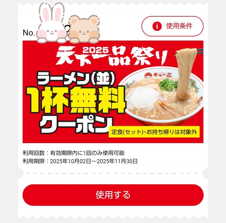 ラーメン1杯無料クーポンが