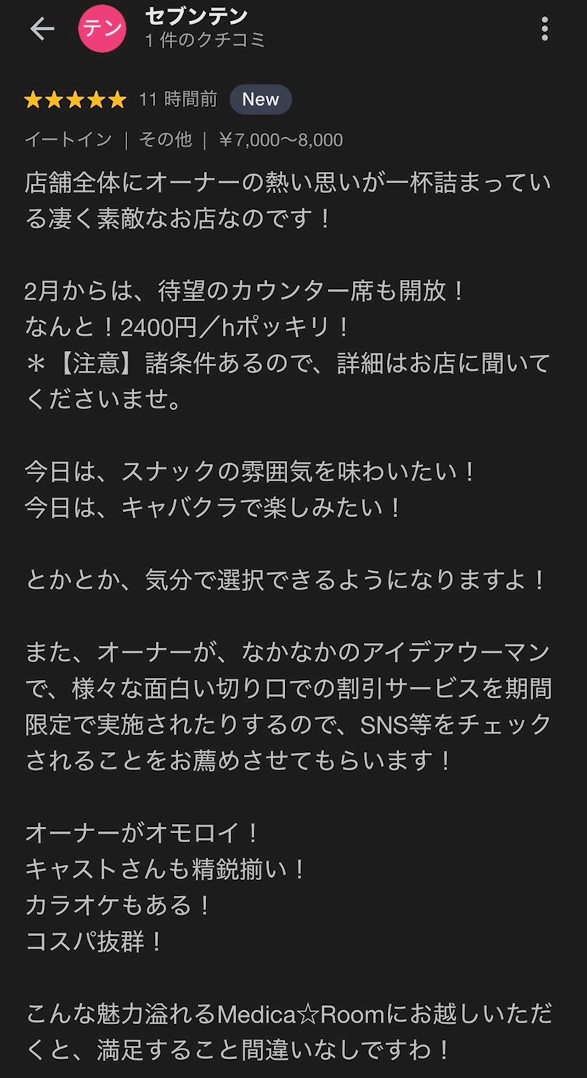 セブンテンさんがGoogleのクチコミ書いてくれておる!! - 0から始めるキャバクラ開業生活☆中川まみ - Medica★Room・メディカルーム - 梅田のキャバクラ