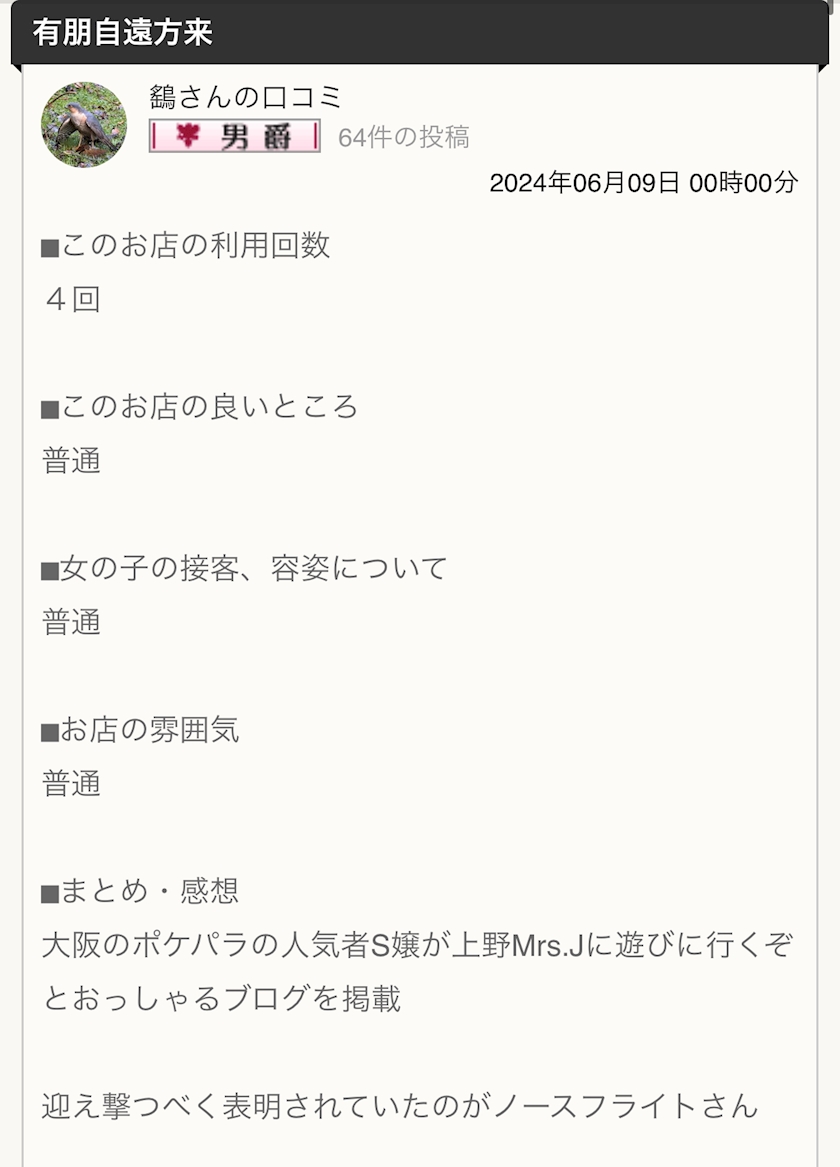 東京上野Mrs.Jでの口コミ体験談を