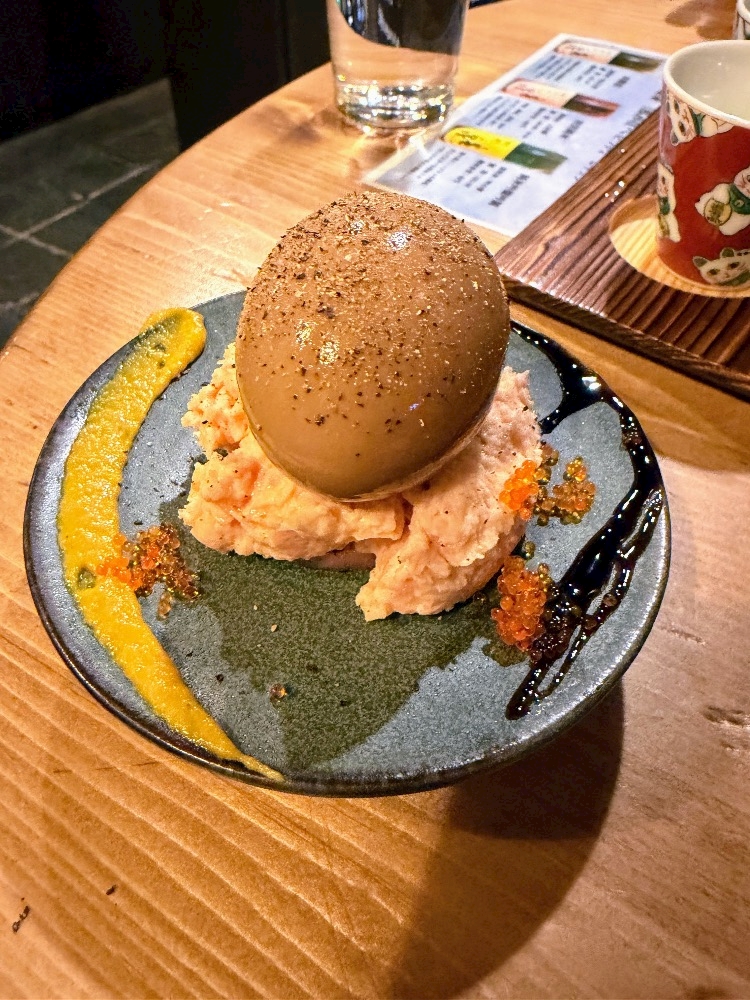 煮卵を自分で崩して