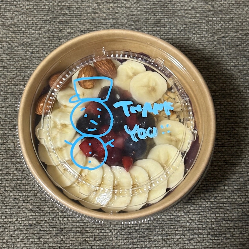 この前アサイーボウルをウーバーしたら蓋にこんなにかわいい雪だるまが描かれていました🥹