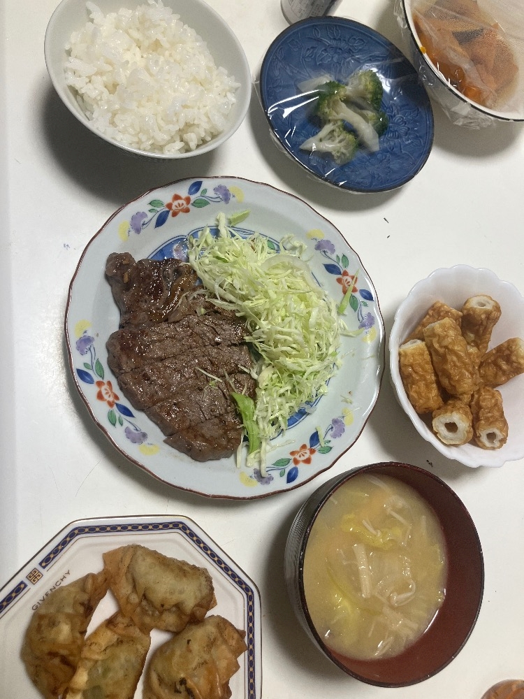 ステーキ🥩と揚げ餃子🥟とチクワと味噌汁etc...
