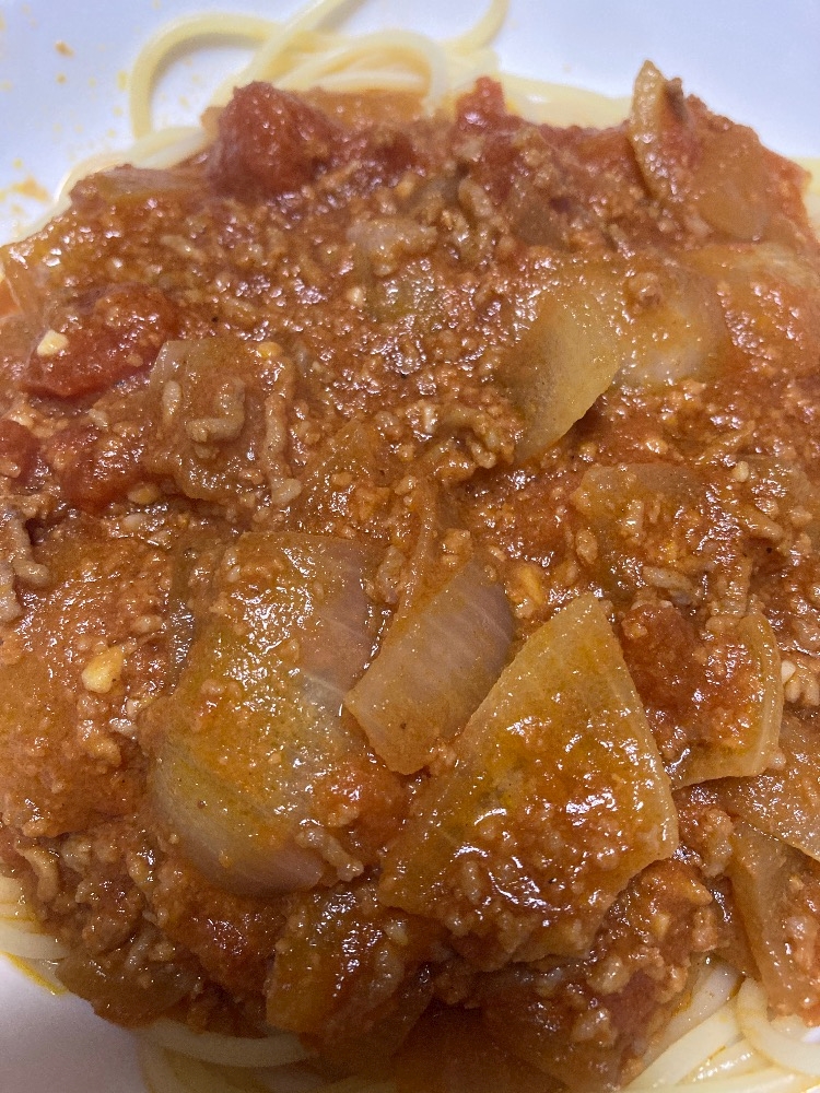これが本日のご飯、ミートソースパスタです