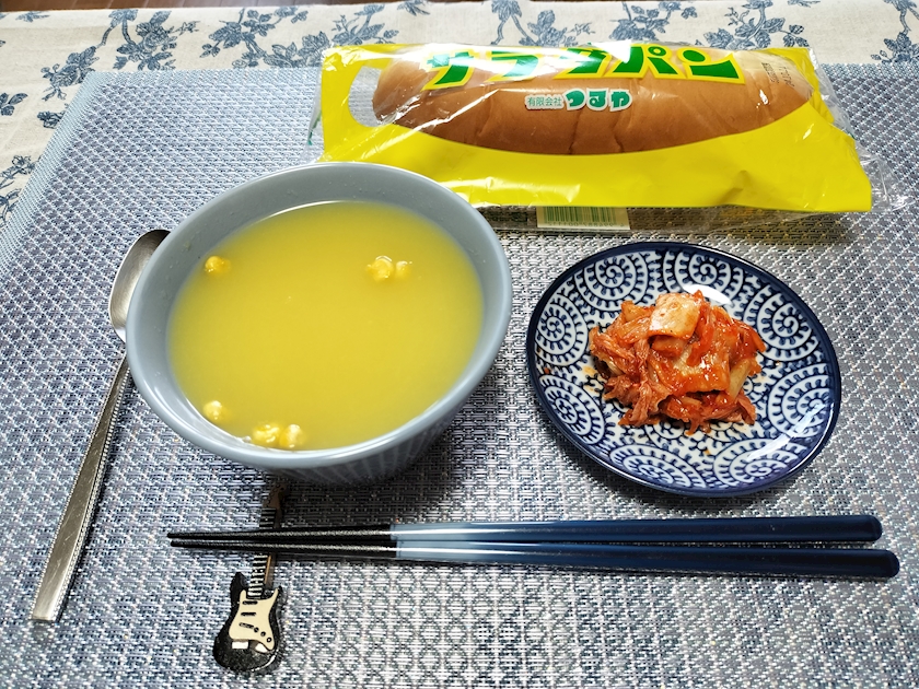昼ご飯にキムチ、コーンスープと