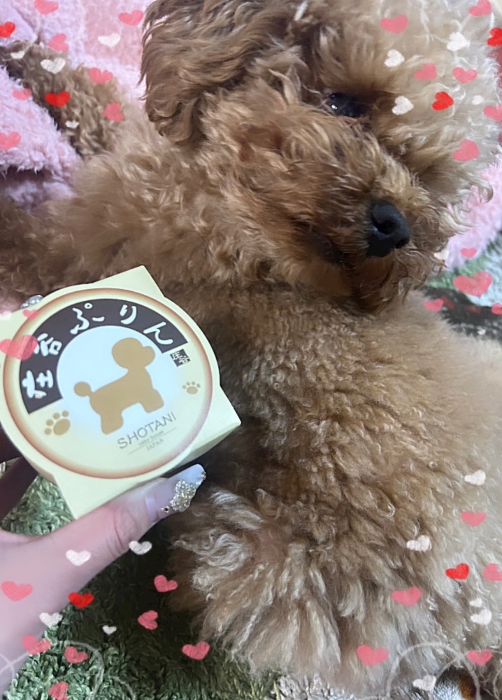 お姉ちゃんがぷりんの名前ついてるぷりん買ってきてくれた🐶🍮