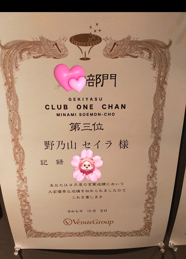 表彰状✨️ - 野乃山 惺蘭 - CLUB ONE CHAN 北新地・ワンチャン キタシンチ - 北新地の熟女パブ/熟女キャバクラ