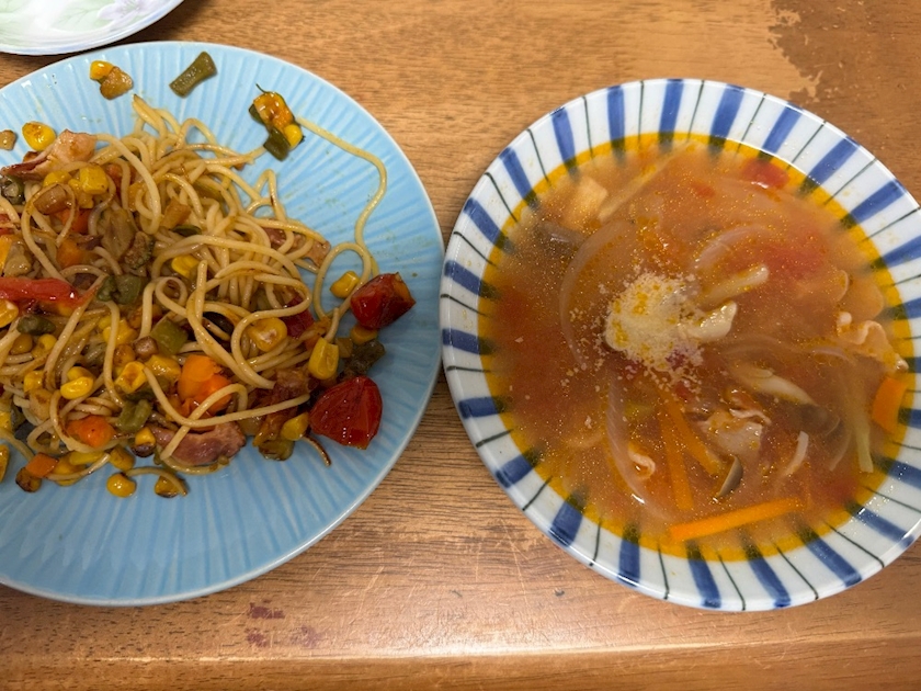 いつぞやのパスタの残りとスープ