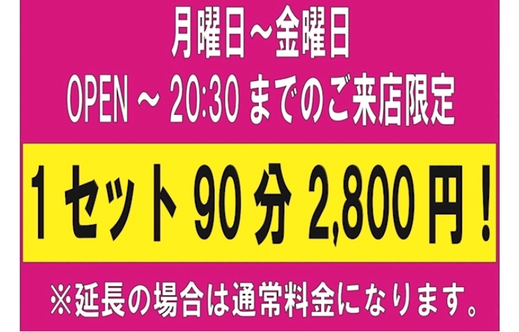 19:00〜20:30の間のご来店は1セット90分で2800円で案内しています🤍