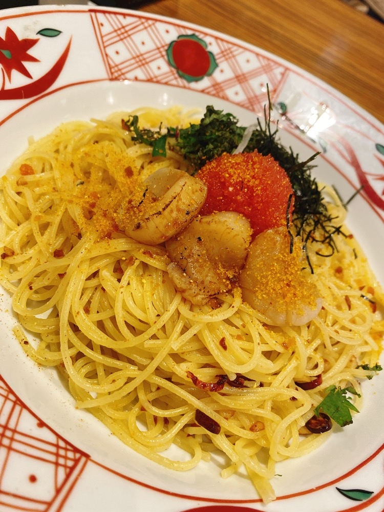 前に仕事おわりに食べためんたいことホタテのペペロンチーノみたいなパスタで終わります