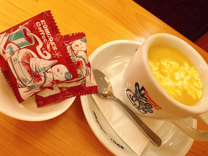 コーンスープを頼んだら豆菓子ふたつもらえたよ