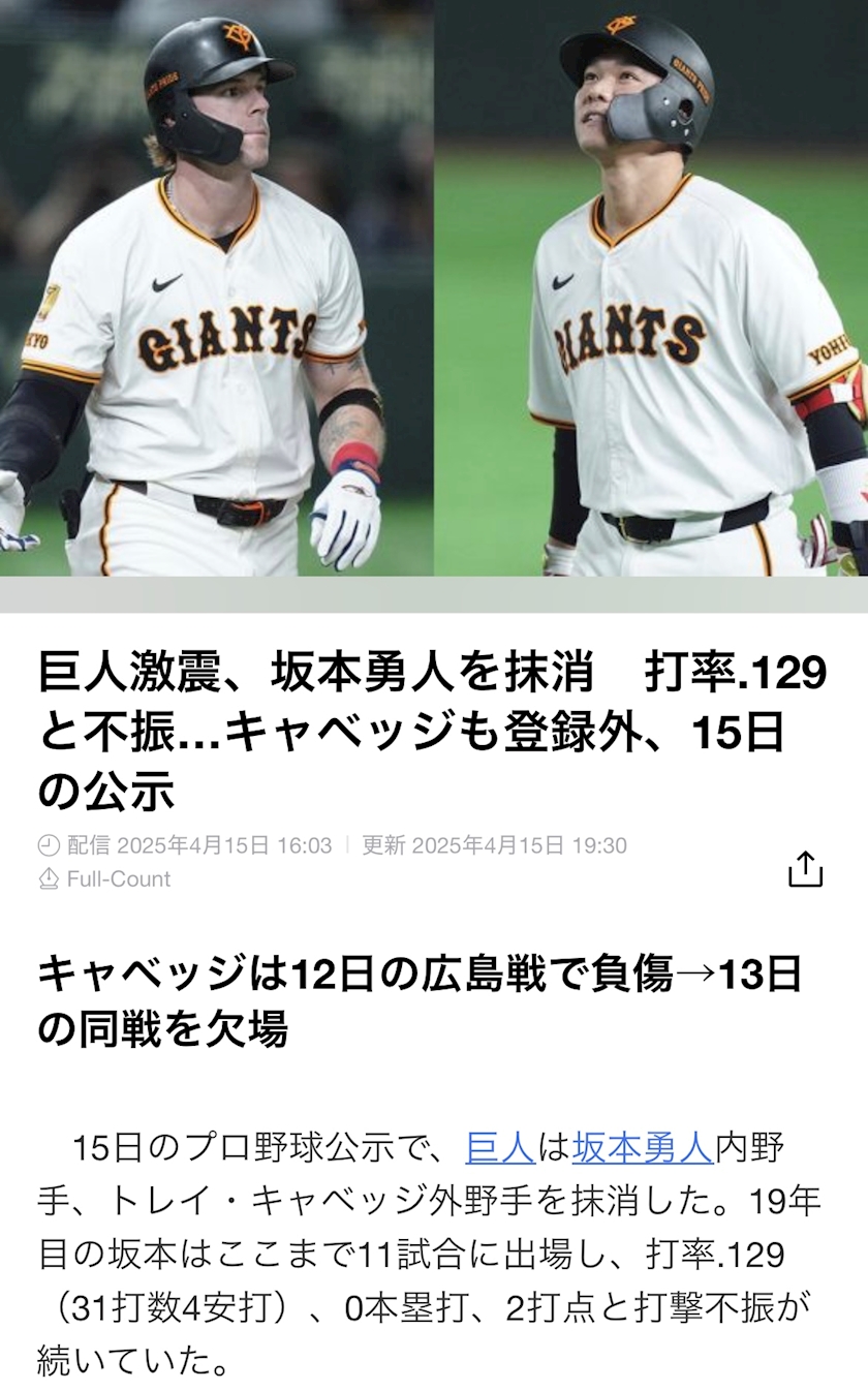 坂本様が2軍落ち、、😭