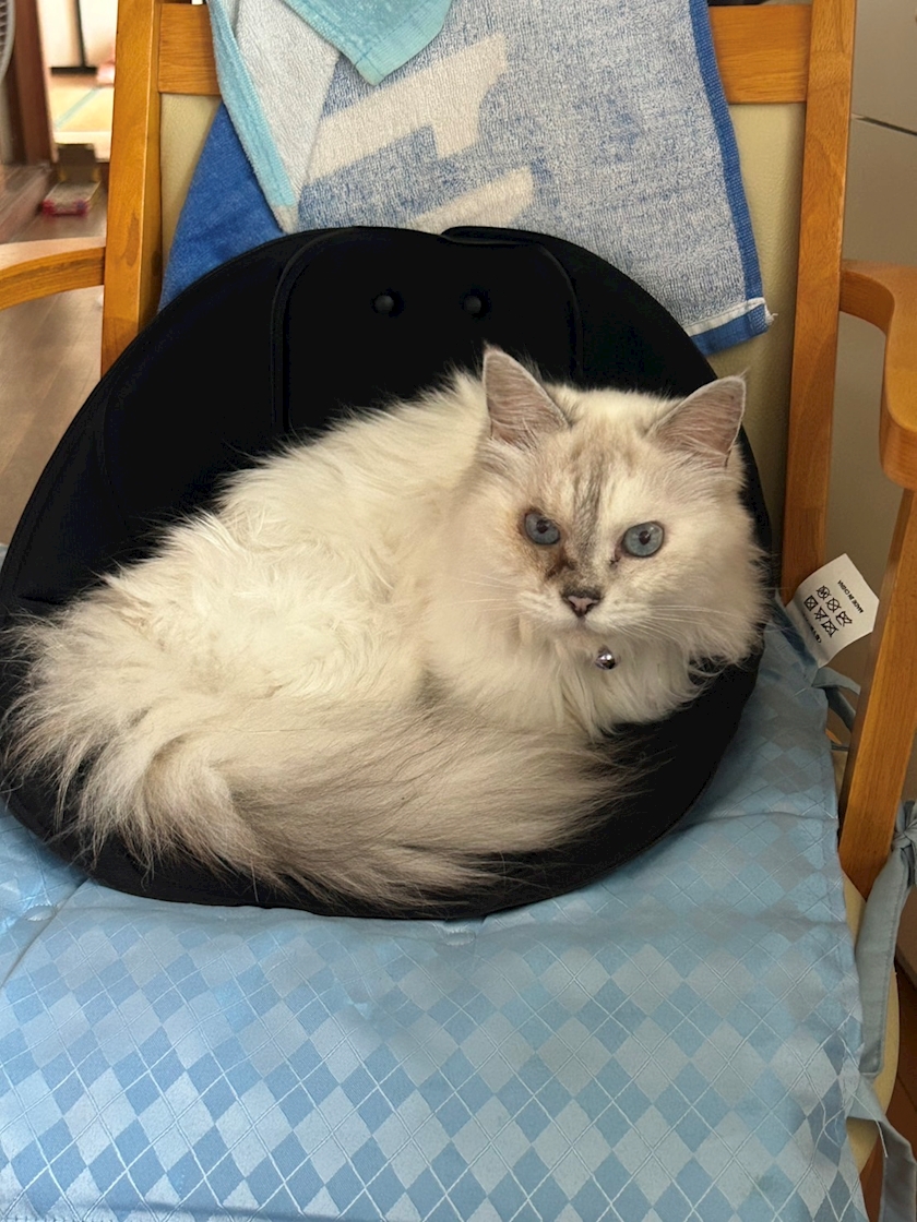 実家の猫ちゃんなんかへんな椅子に座ってる🥺