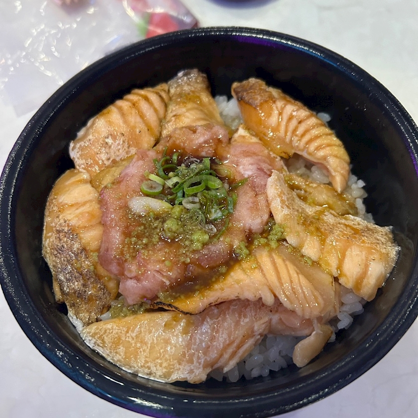 ずっと食べたかった炙りサーモン丼といちごのおすそ分け🍓✨
