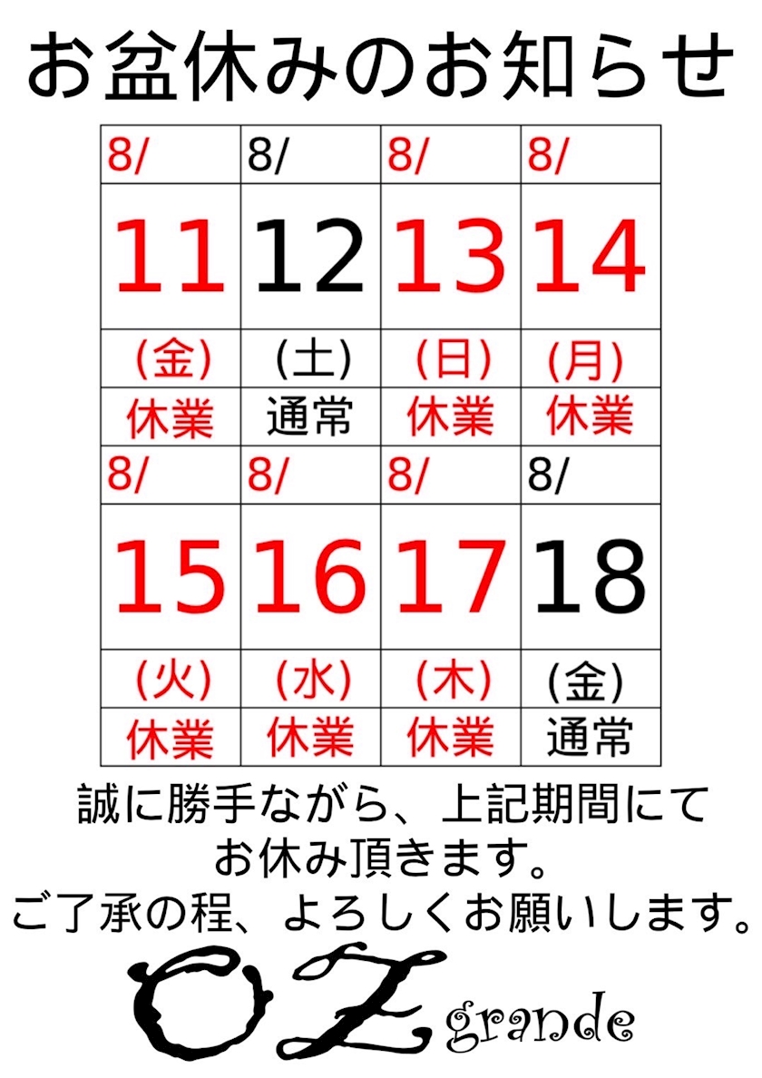 お盆休みのお知らせ~🎵 - 美樹ママ - OZ grande・オズグランデ - ミナミのラウンジ/クラブ