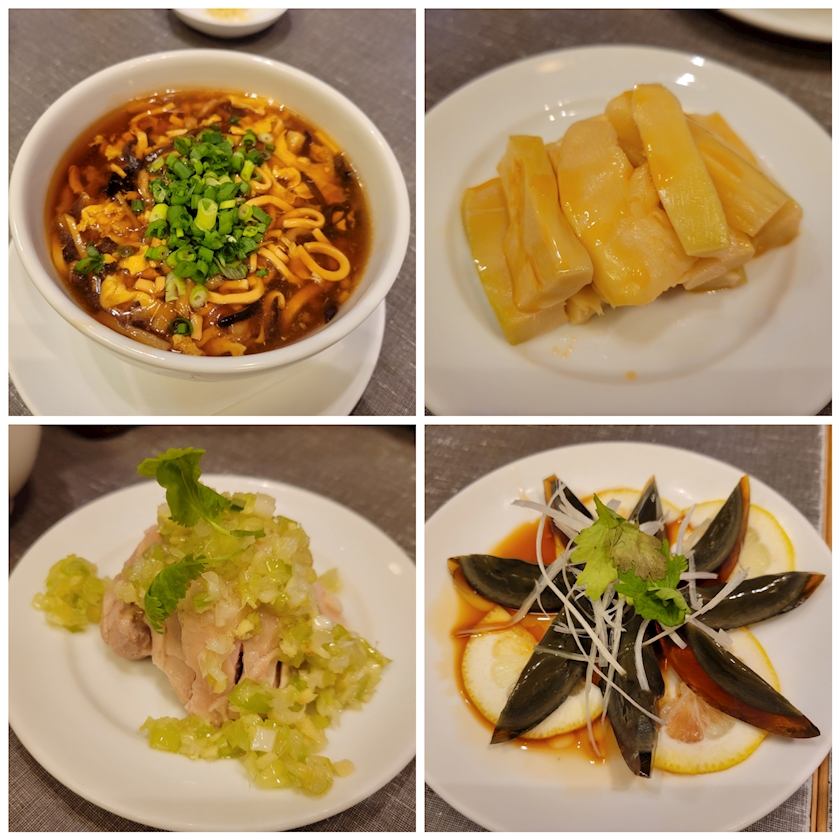 サンラータン、メンマ、蒸し鶏のネギ塩
