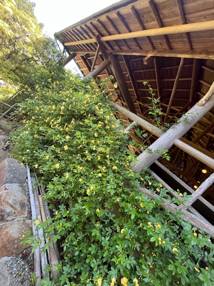 食堂には小さな黄色のバラが壁に巻きついてて
