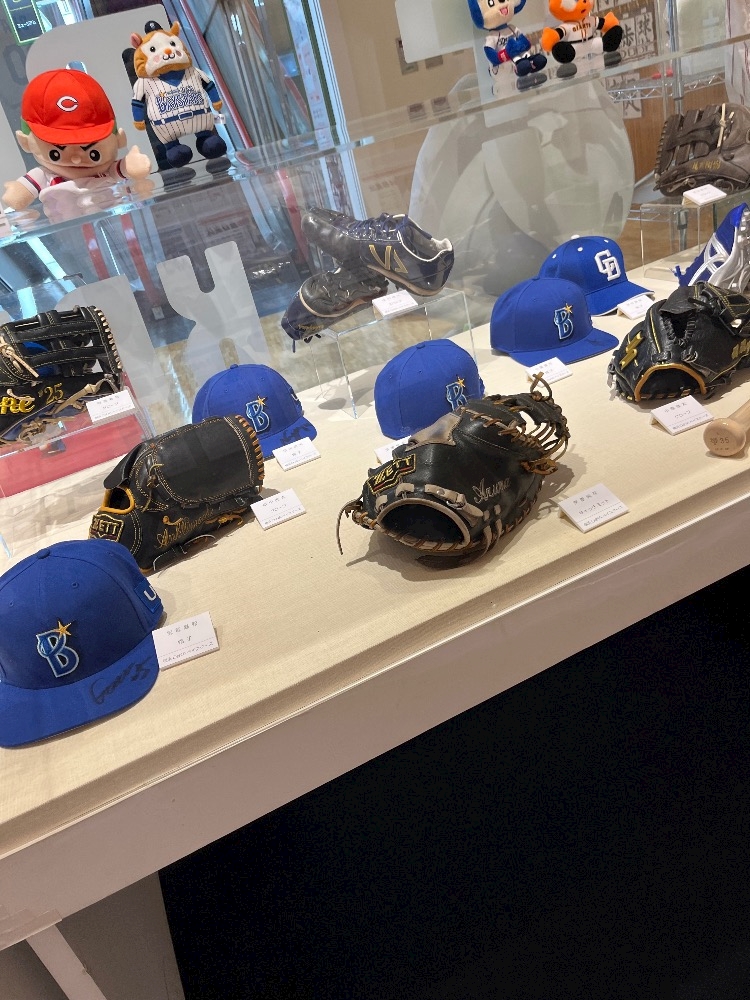 野球の帽子やグローブ、ユニフォームなどが展示されてるんです