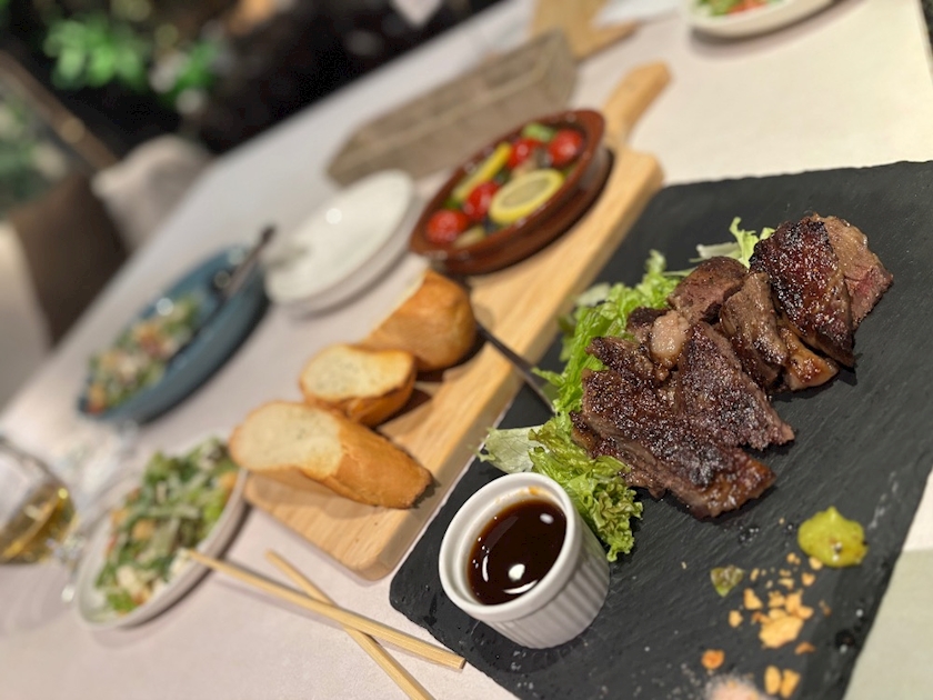 お肉とサラダ食べて