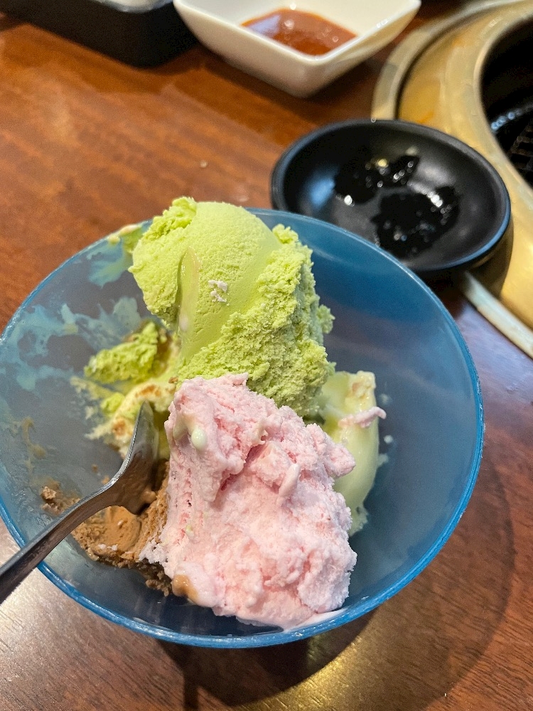 抹茶、チョコ、ストロベリー、柚木シャーベットの4種混ぜのような、アイスを食べさせていただきました😱🫠😱🫠🤣🤣