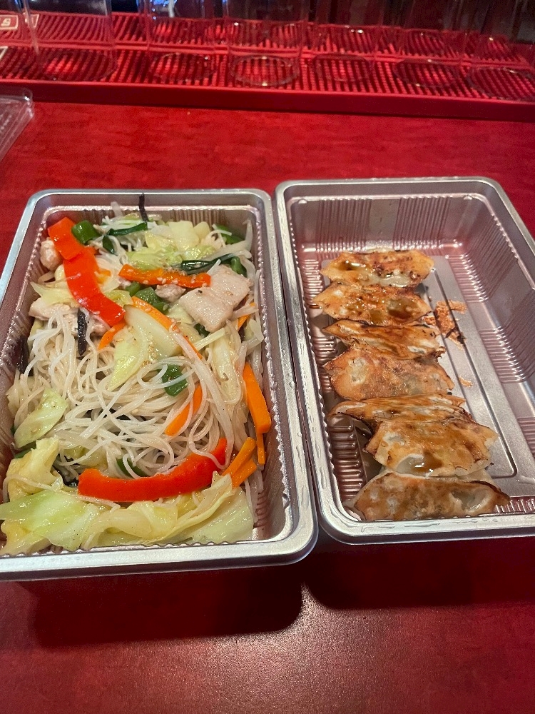 チーママとお同伴のI様から、弍ノ弍の餃子とビーフンのお土産いただきまして、さっそく食べましての開店😋😋😋
