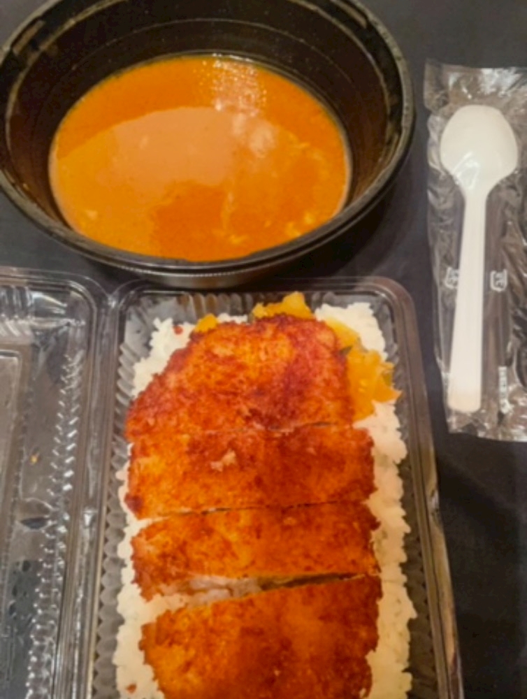 夜ご飯は、近くのカレーうどん屋さんから、カツカレーの出前😋😋😋