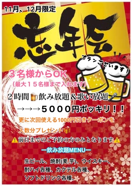 11月12月限定で忘年会プラン作りました🎵