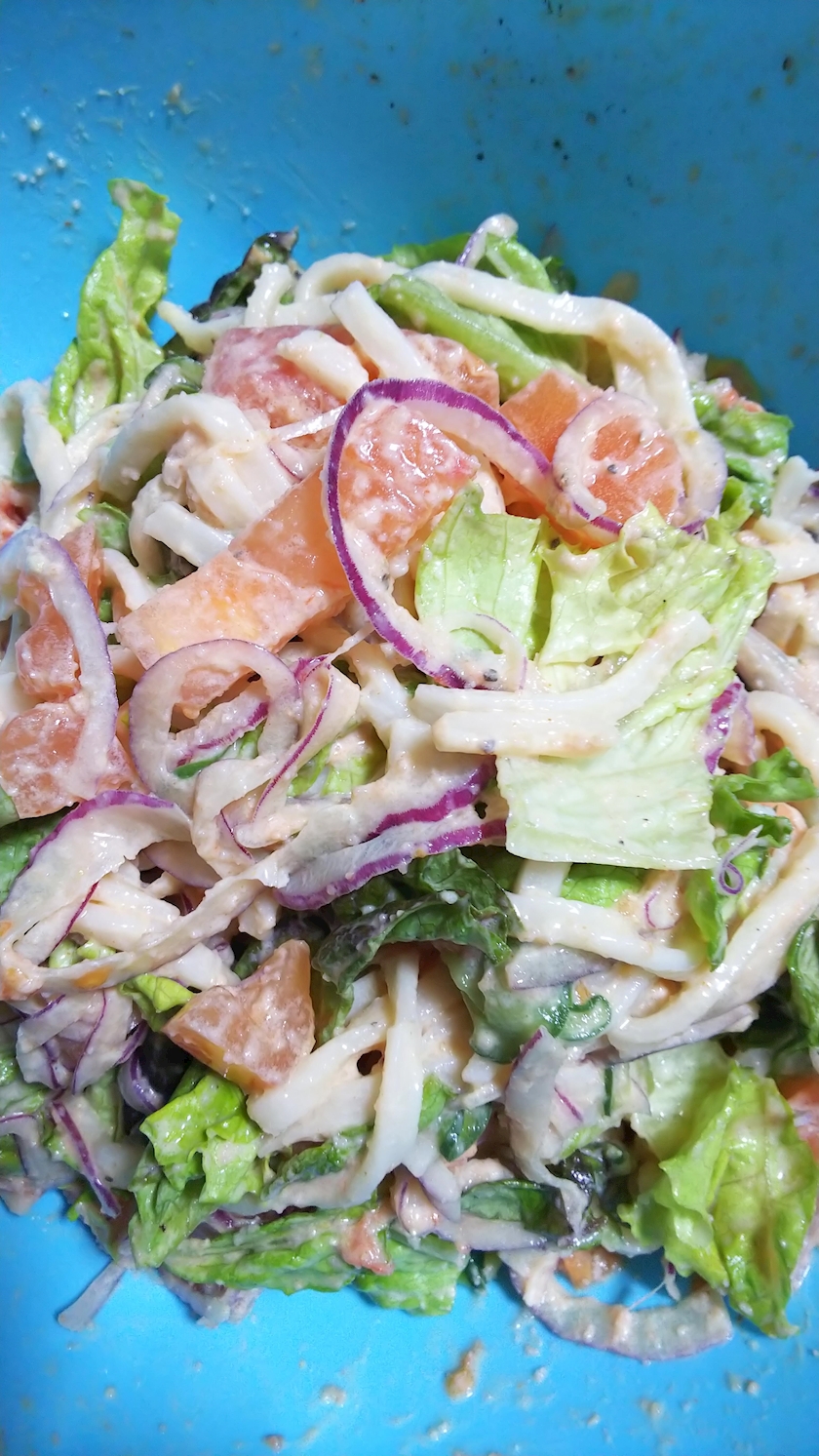 夕食🌃🍴は残りのサラダを明太子パスタマヨネーズ和えしました