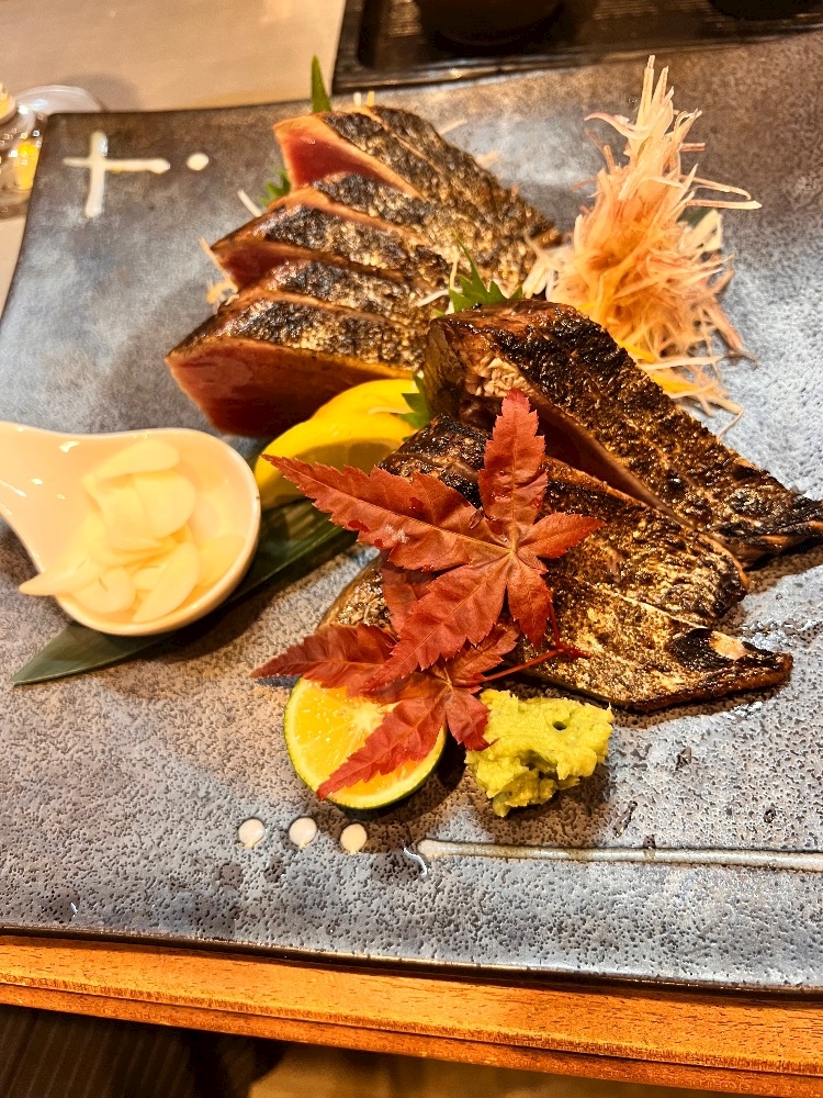 カツオの皮をあぶって柔らかくして、風味を出して、旨みを閉じ込めるんだって😊