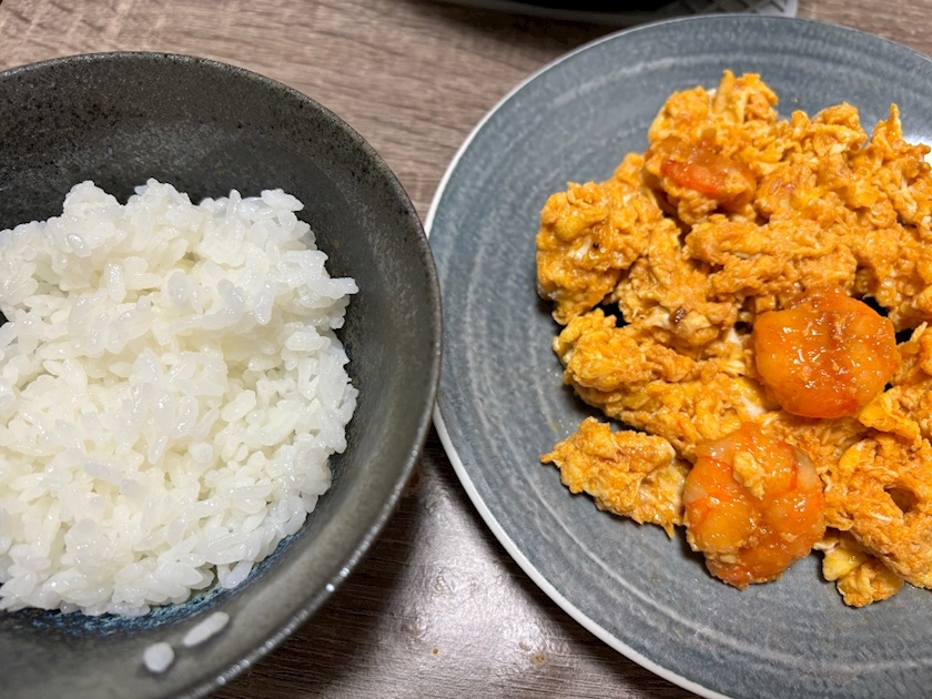 エビチリ玉子と新米🦐🌾