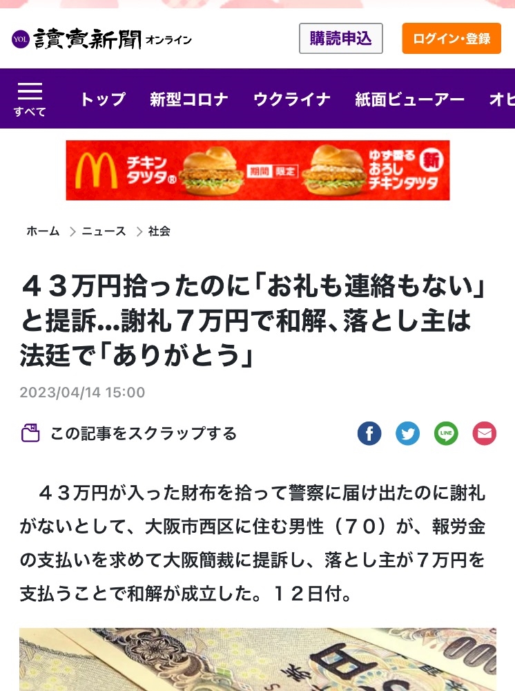 43万円を拾った方が裁判したニュース