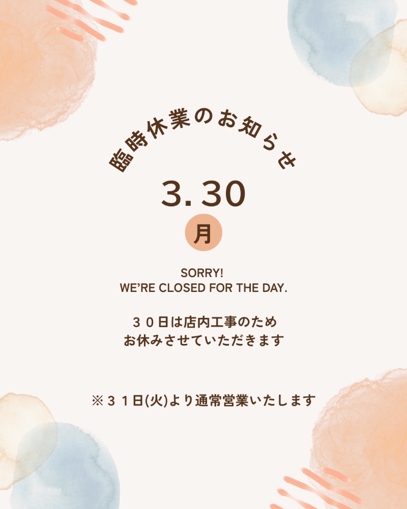 ★3/30(月) 臨時休業のお知らせ★