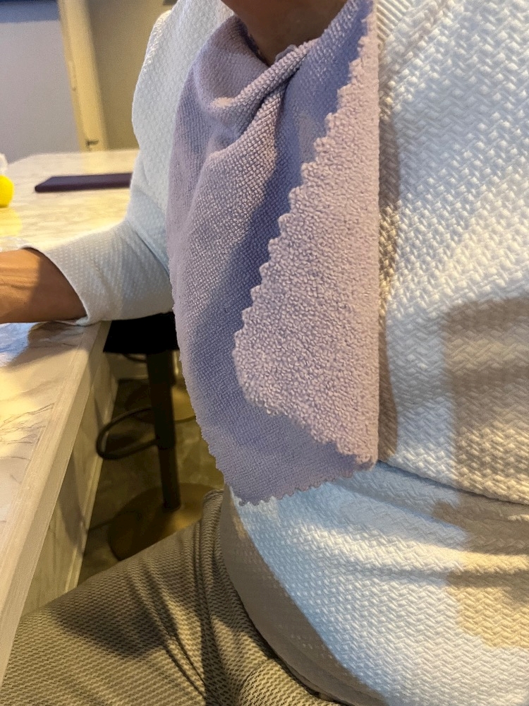 ↑白い服なので、エプロン代わりに、防水タオル・・・😀