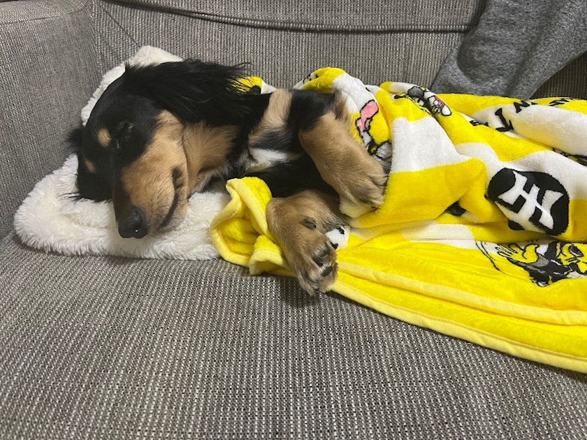 阪神のブランケットを掛け布団にして