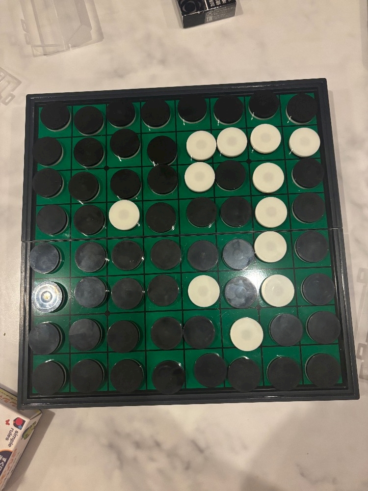 先日、ボーイさんとオセロ対戦をしたんですけど、中盤でちょっといい感じになったと思いきや、終盤、白が見当たらなくなってきて(私が白色です⚪️)、ボロ負けしました😂😂