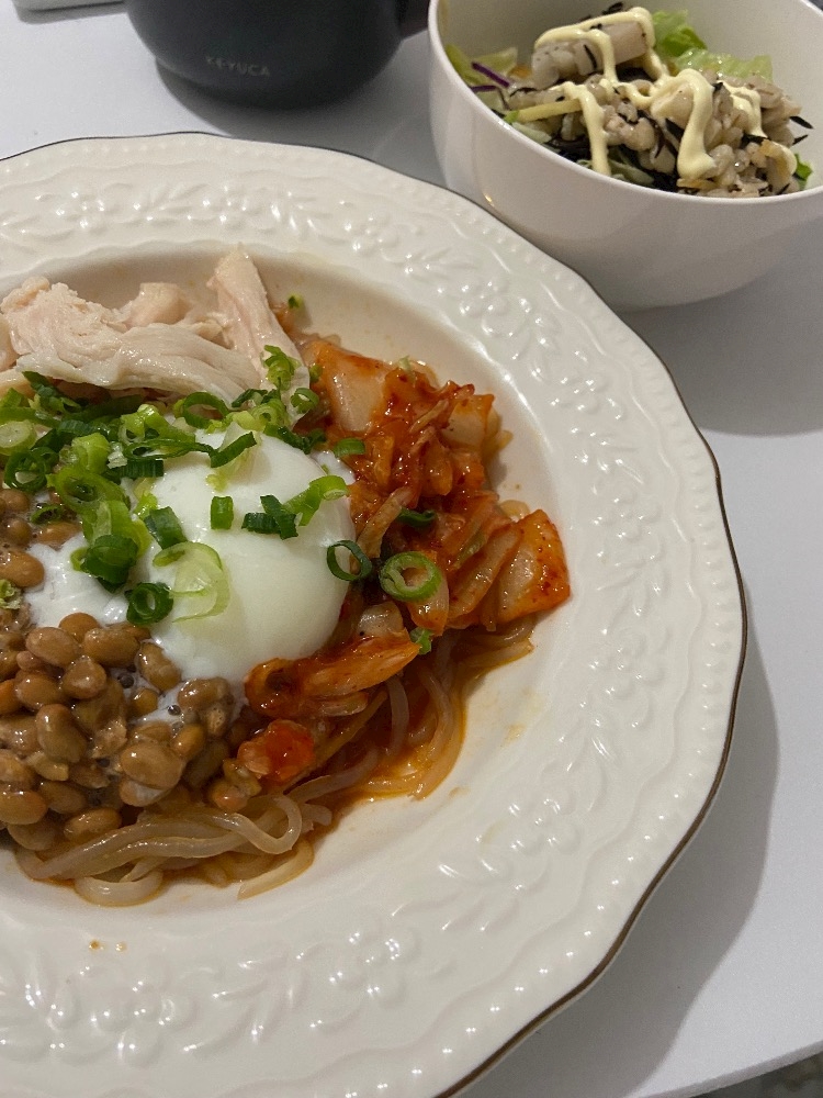 キムチ×納豆×温玉×鶏ムネの最強セット💪🔥
